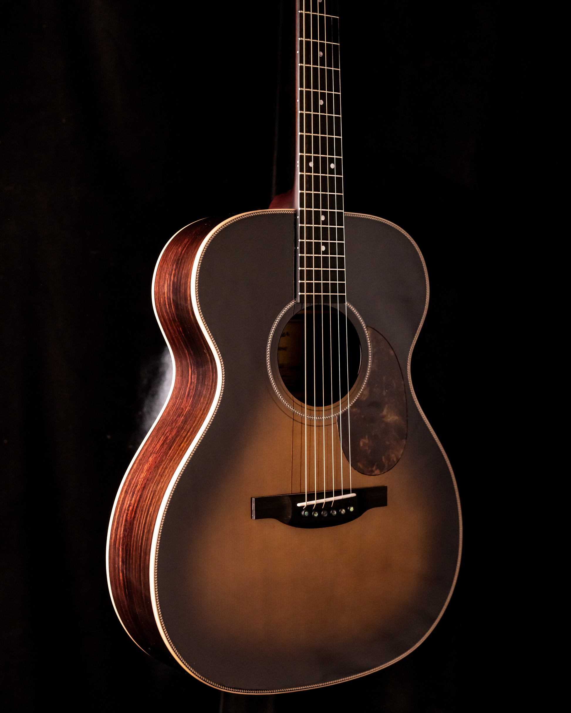 The beautifully balanced sound of this OM hybrid is crisp and surprisingly loud. It has great playability and looks, with herringbone trim and maple binding surrounding the AAAA Adirondack top. This one is finished in a classy burst, while the back and sides are East Indian Rosewood. As shown in the photos, there is some nice color contrast on the back!