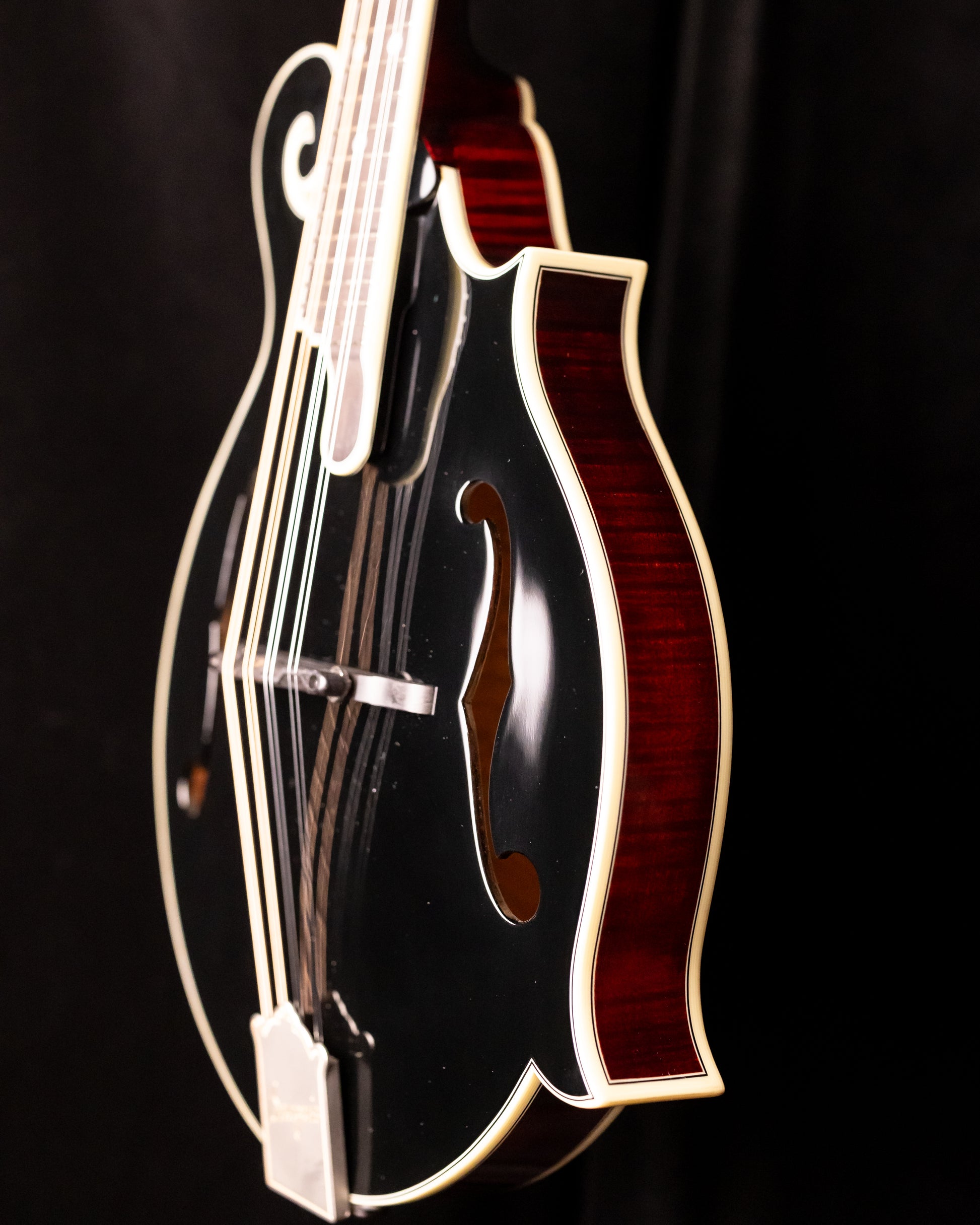 Black gloss top and prepared with Dana’s all-torrefied “secret sauce” of Adirondack spruce and European maple, Bourgeois’ first F-style mandolin is a unique take on a Golden Era classic. Bill James tailpiece, Golden Age tuners, Loar-style case and our signature Amaryllis inlay round out the simple but elegant appointments of this value-saturated model.