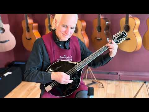 This fine instrument is crafted with all solid, aged tone woods - Adirondack Spruce on top, European Curly Maple on the sides and back. Includes Loar style rectangular case.