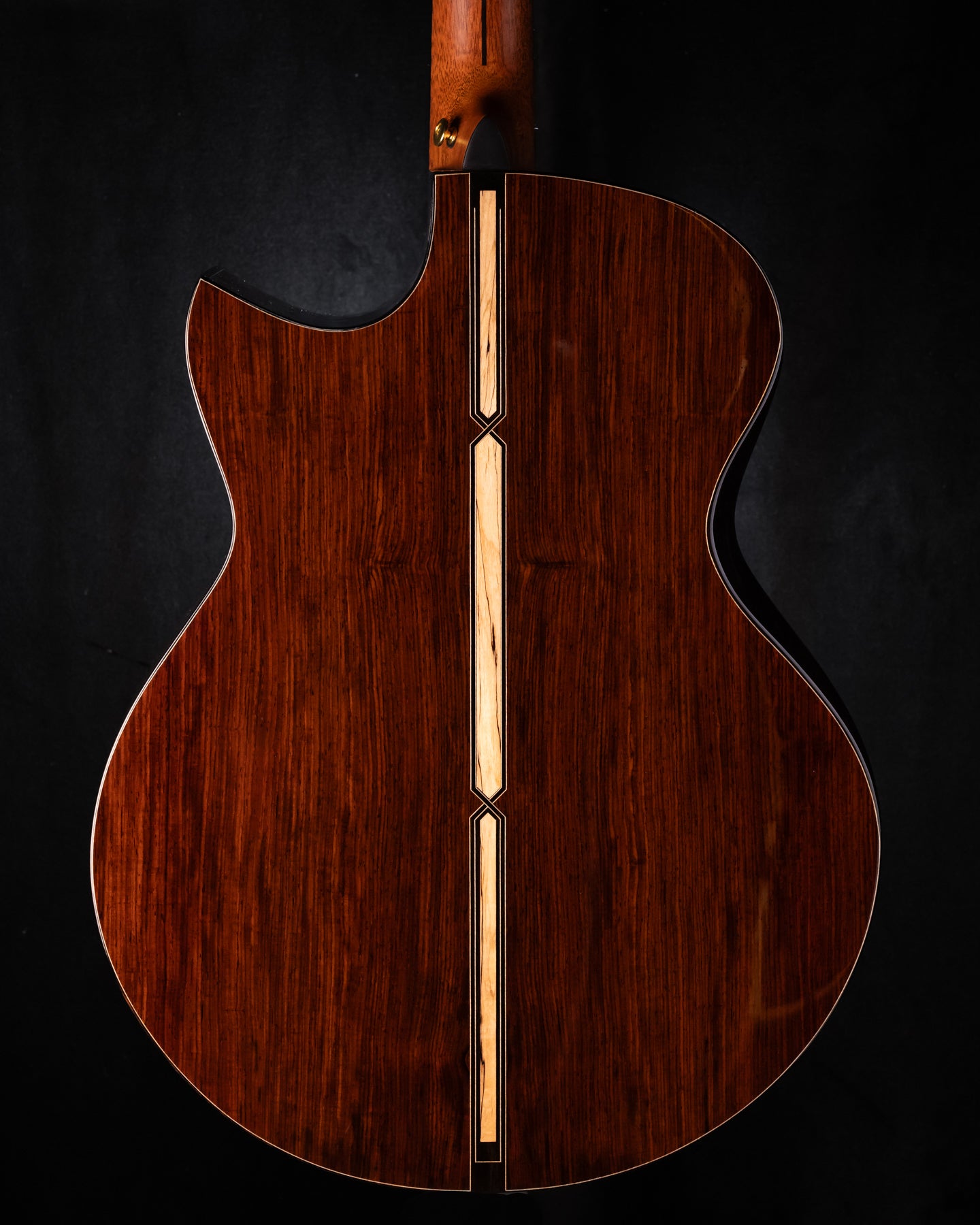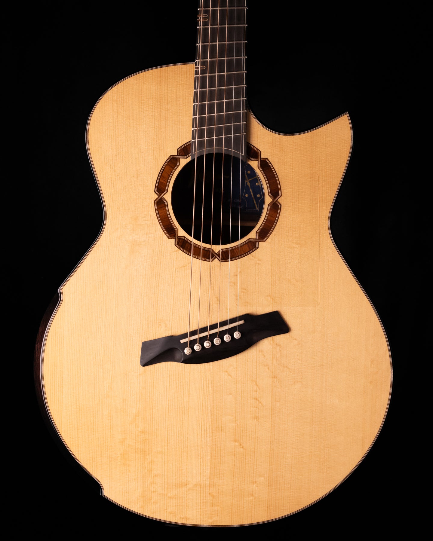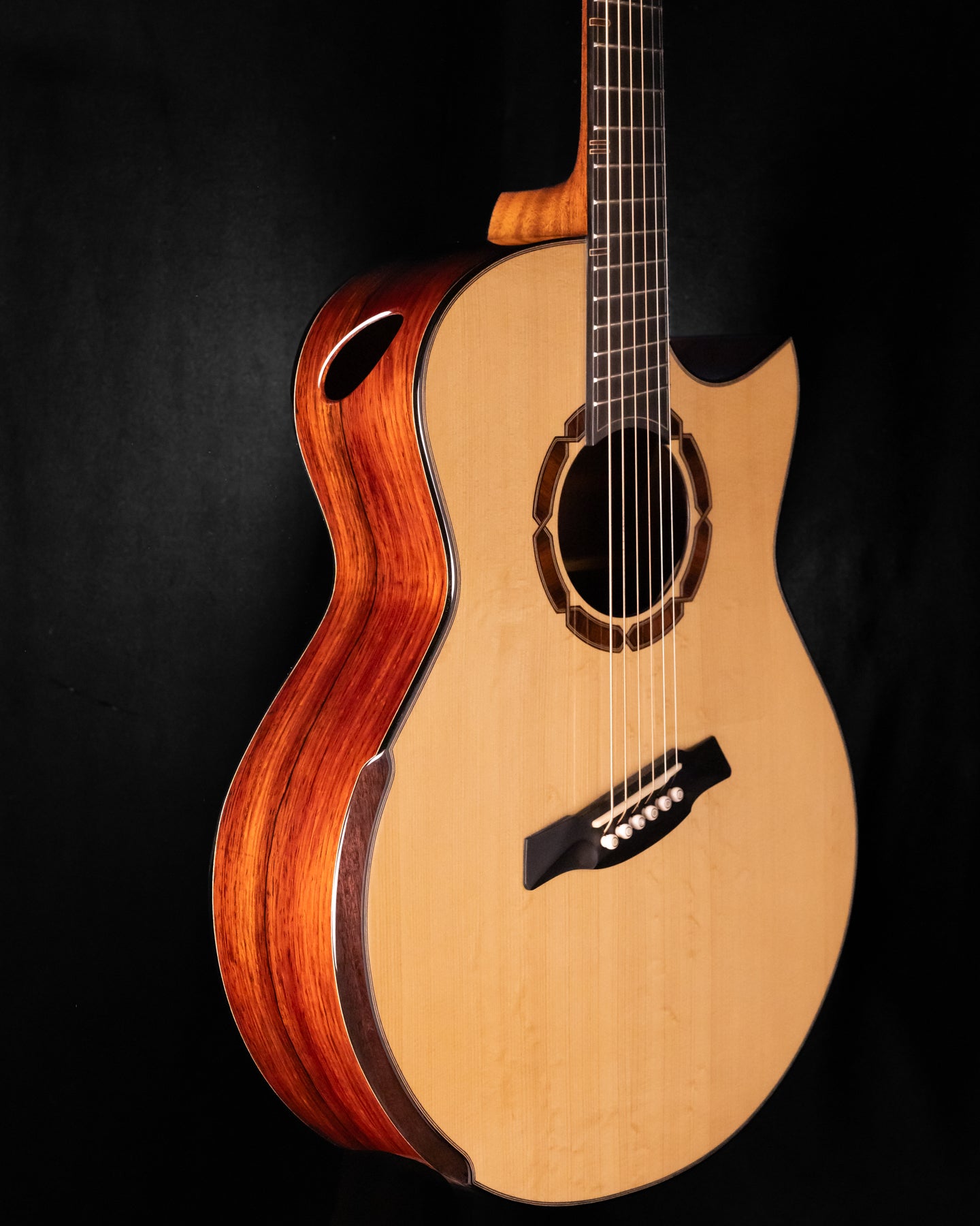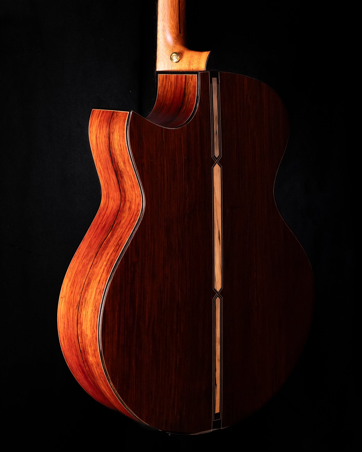 Medium Jumbo with Florentine Cutaway, Soundport, Back body Bevel and Beveled Armrest, solid Sitka Spruce top with solid Mexican Cocobolo back & sides, Carbon Fiber Reinforced Mahogany neck, Ebony bridge & fingerboard, Solid Lining with Double Sides and Adirondack Brace, Hozen Lattice Bracing.