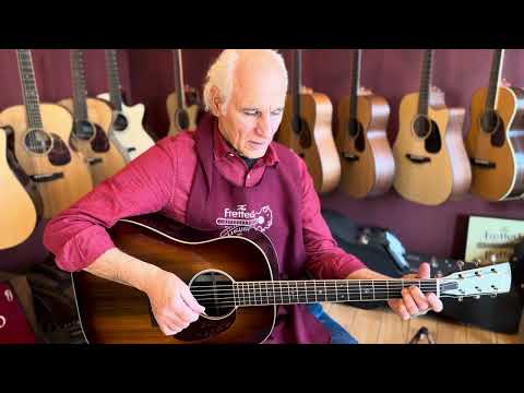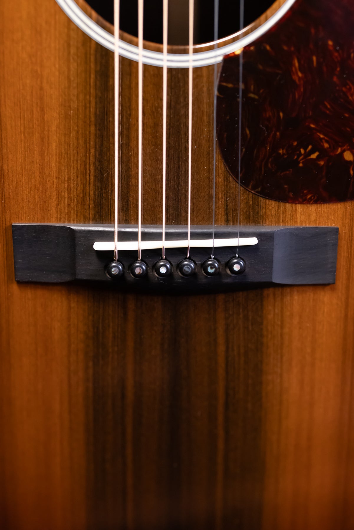 It's built with Huss & Dalton's radiused top, which helps emphasize midrange tones, 14 frets to the body and long scale at 25.4", it has a nut width of 1-23/32" with string spacing at the saddle of 2-7/32". It has a larger sound hole diameter of 4-3/8" which helps to give this guitar extra punch!