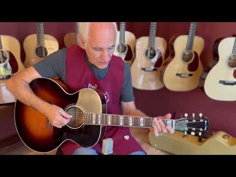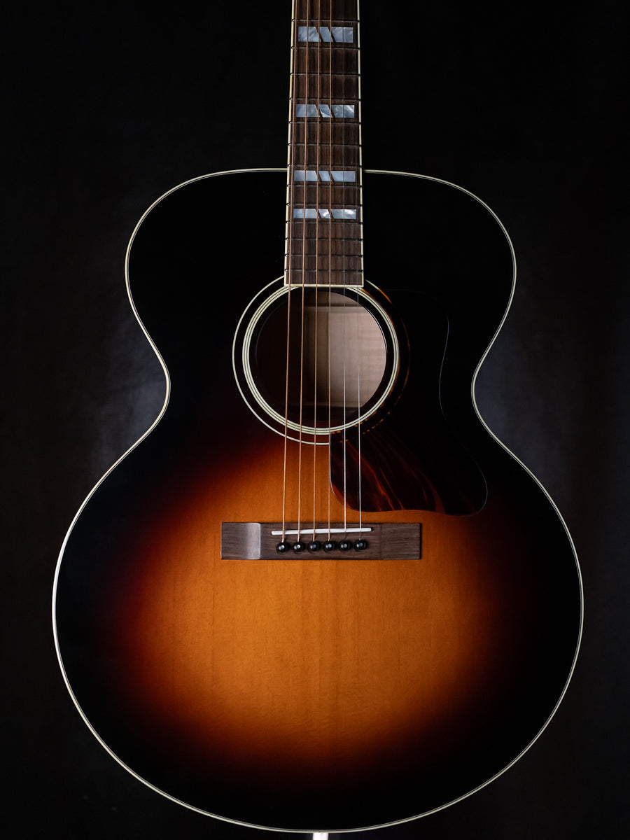 Brand New Huss & Dalton MJ Crossroads Deluxe, a mid sized jumbo with a beautiful sunburst all around, with a Sitka Spruce top and a Flamed Tiger Maple back and side set. Short scale, with a nut width of 1-3/4". 2-5/16" spacing at the saddle. The guitar is built with a flat top for increased bass response ( the standard MJ is built with H&D's radiused top for increased mid range response). The body is 16" across the lower bout, and is 4-1/2" deep at the end pin.