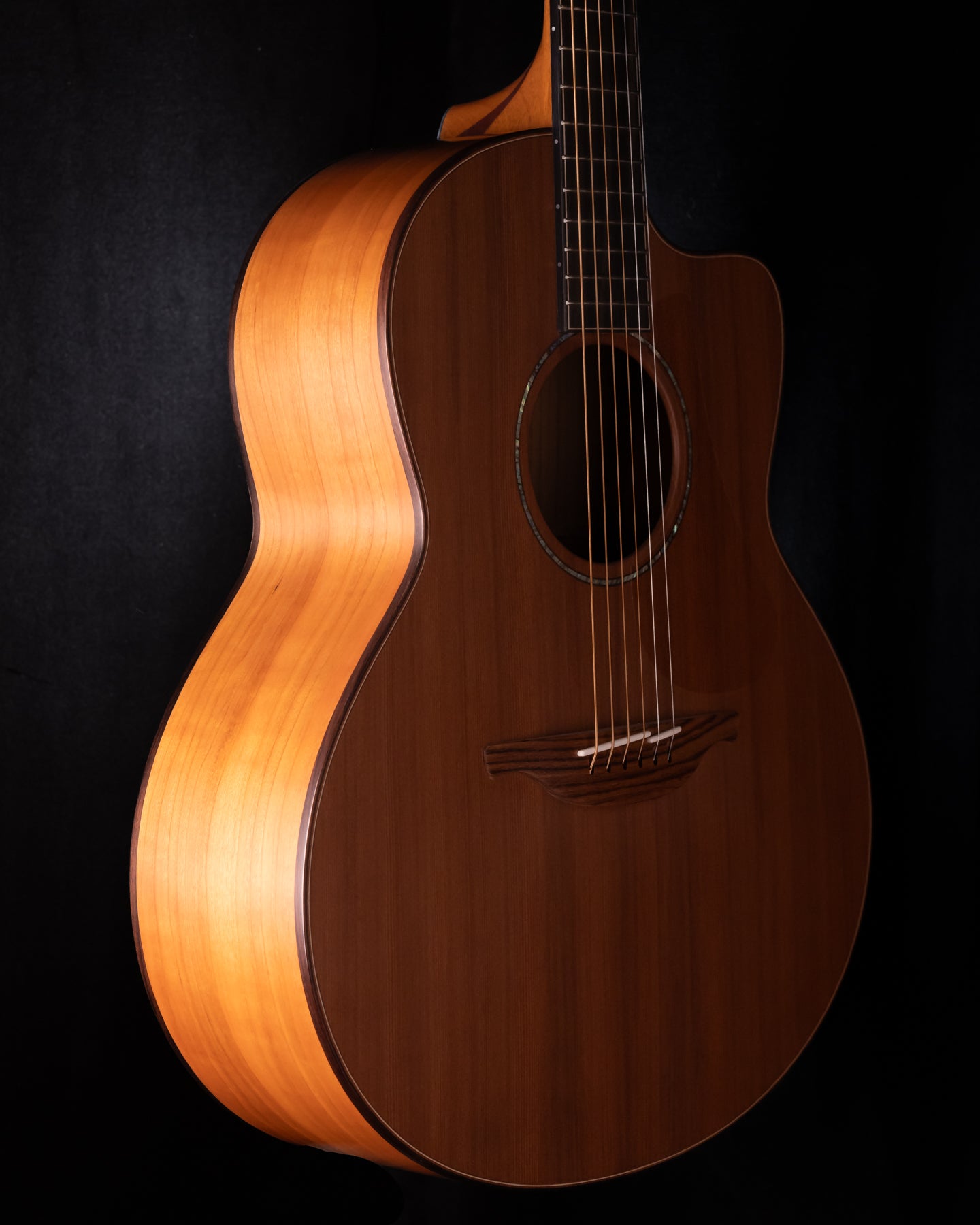 Another masterpiece from Lowden Guitars in Northern Ireland! This one features a Sinker Redwood top and a beautiful set of straight grained, well book matched Cherry for the back and sides. Deep and resonant, with rich lows and clear highs. Not overly forward in the midrange, especially for a Redwood soundboard. Redwoods (which are in the Cedar family) tend to be mid forward, but this one not so much. Its an excellent example of classic Irish voicing.