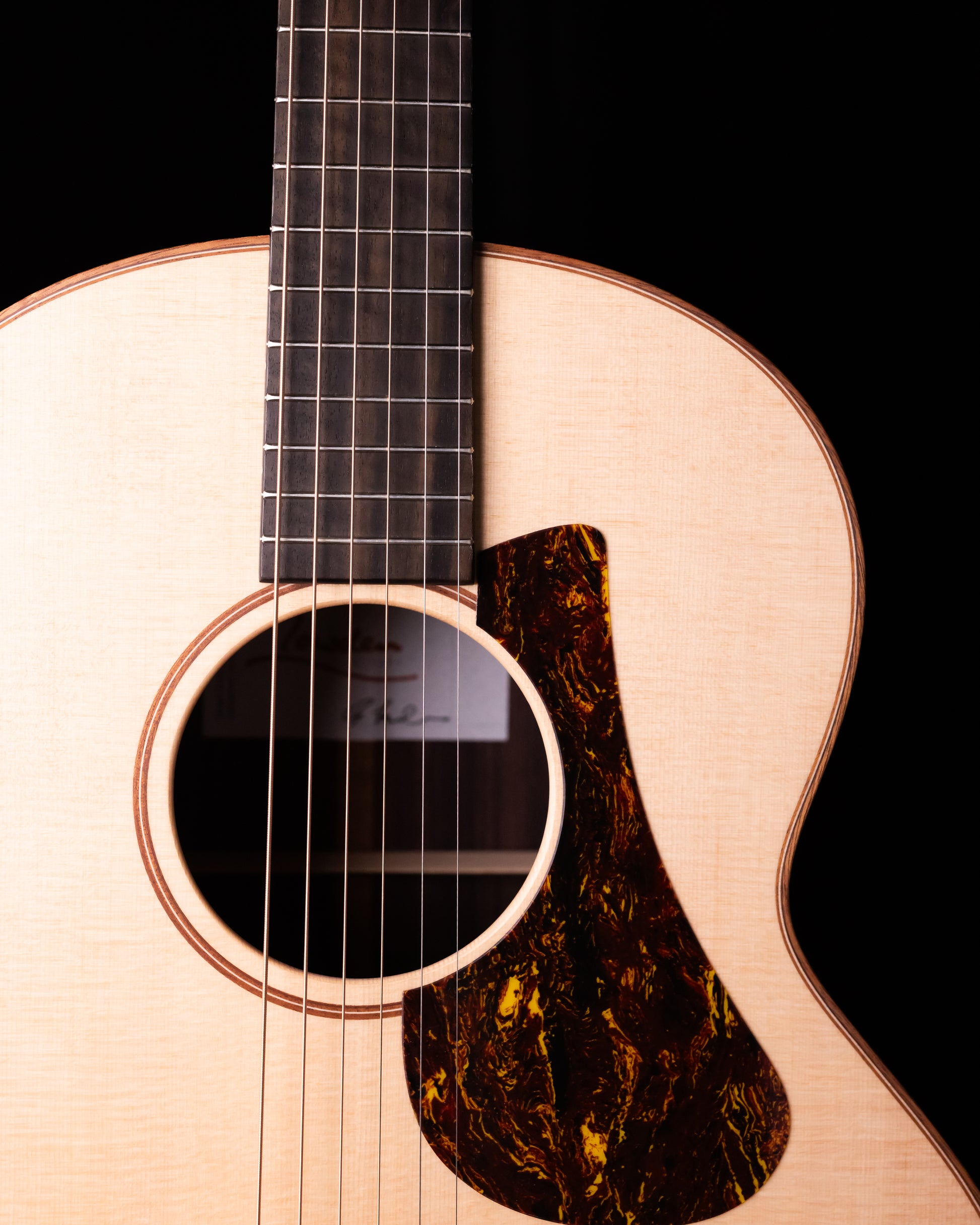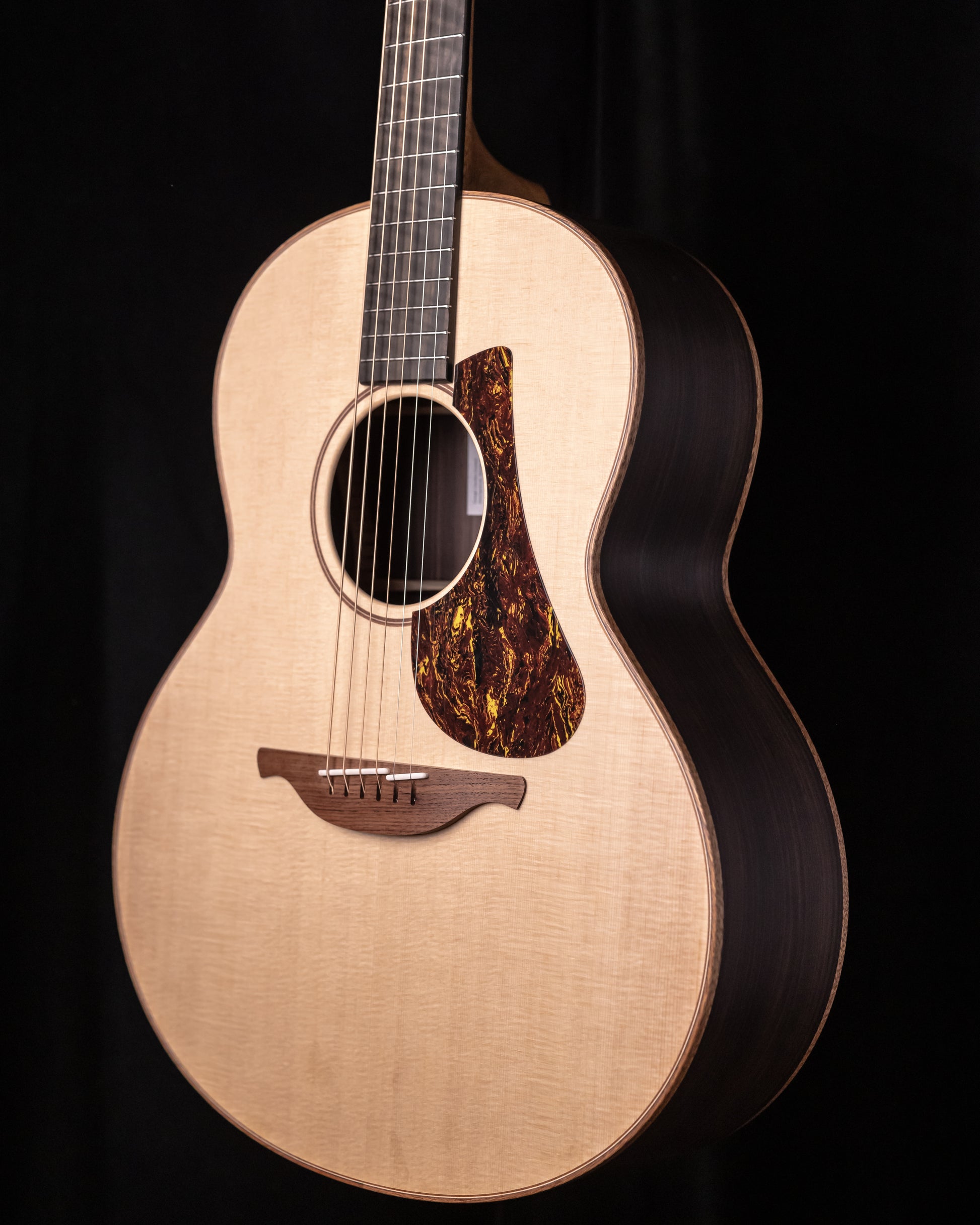 Nut width 1-3/4"; Long scale at 25.6". The bridge is 2 piece bone, compensated for better intonation. Sitka Spruce soundboard with Indian Rosewood for the back and sides.