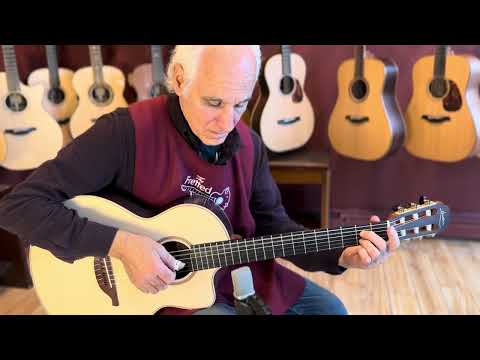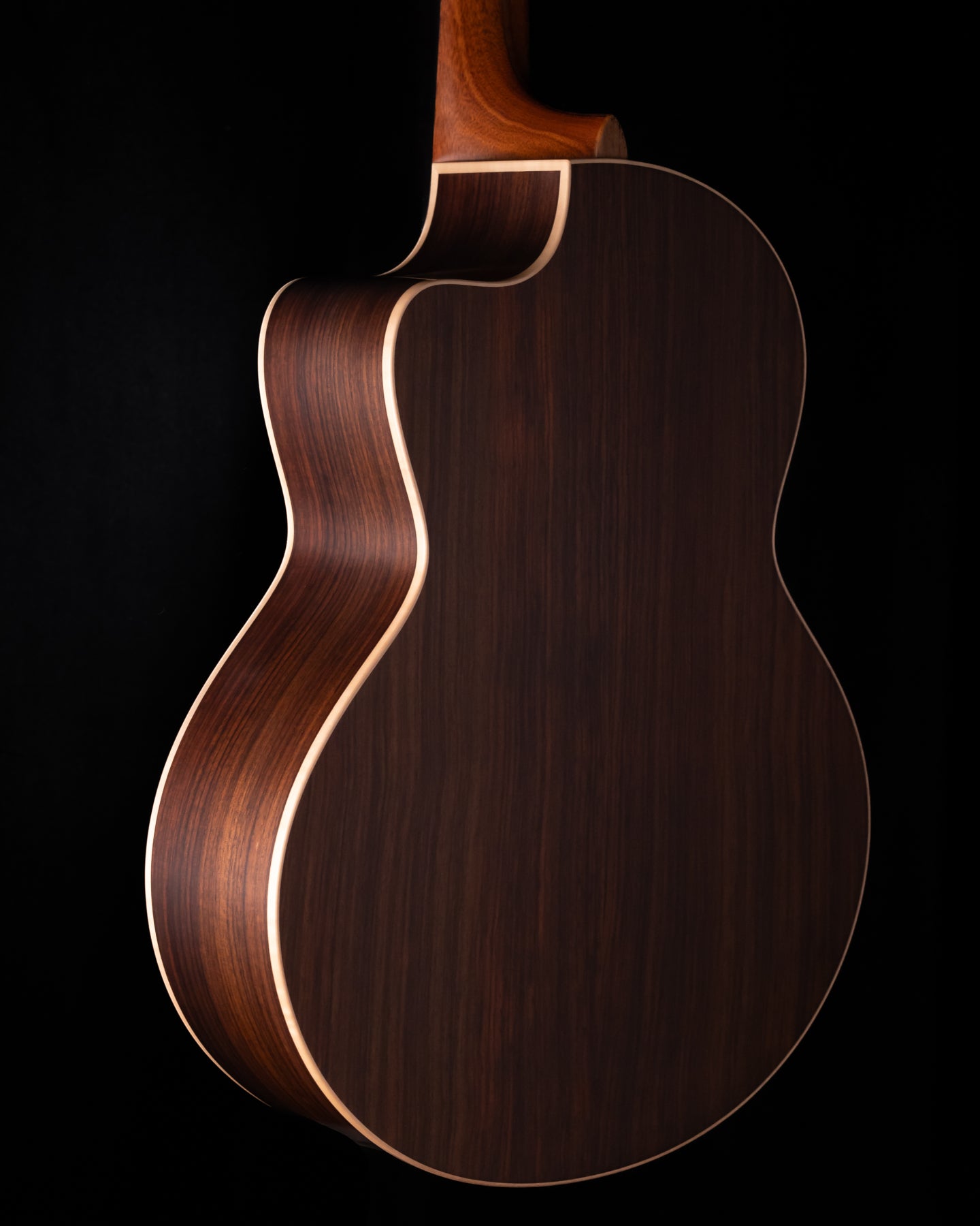 “I designed the Jazz series with nylon strings and an internal pick up fitted as standard so that it would feel very comfortable for classical and steel string players alike. The neck has enough width to facilitate the nylon strings but at the same time the cambered fingerboard allows for a wide variety of playing styles. Voiced for a really great acoustic response, and at the same time stiff enough for loud volume to be possible without the whole guitar over-reacting when played loud through a sound system. The tone is very natural and full with none of the over bright tones sometimes found on too lightly built classicals. I re-designed these models in 2003 to improve the acoustic voice."